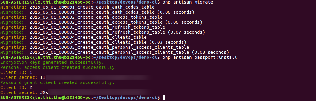 Sau khi cài đặt xong, chạy lại lệnh migrate đểmigrations các bảng liên quan đến laravel/passport: