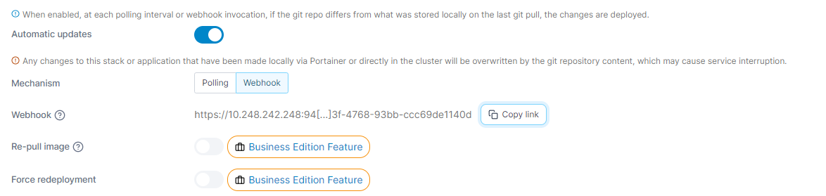 - Automatic Update: Bật tự động cập nhật. cho phép tự động re-deploy ứng dụng. Đây là điều kiện đảm bảo GitOps được cài đặt. Portainer cung cấp 2 cơ chế Polling và Webhook