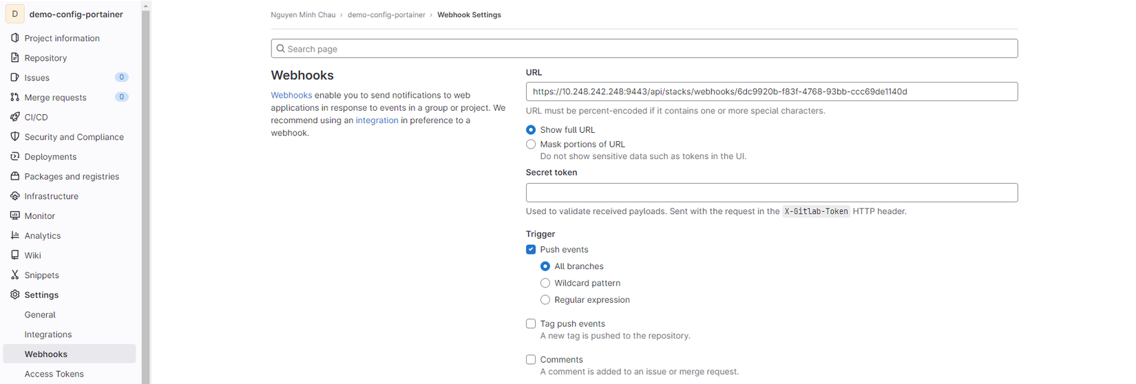 Trường hợp sử dụng cơ chế Webhook để thực hiện automatic update, Git config repository cần khai báo webhook stack đã tạo và kích hoạt sau mỗi lần được push code. Ta truy cập vào config repository, chọn Settings -> Webhooks, khai báo URL và trigger Push Event