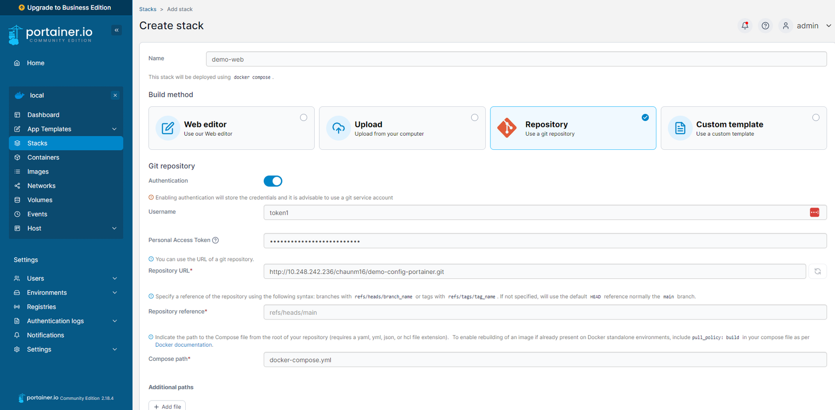 - Nếu mã SHA commit gần nhất không trùng với mã SHA của stack, portainer sẽ kích hoạt re-deploy lại ứng dụng qua compose path: