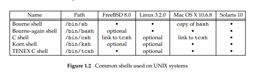 Mỗi lần chúng ta đăng nhập, một vài thông tin về hệ thống sẽ được hiển thị, và sau đó chúng ta có thể gõ lệnh vào shell (Một vài hệ thống bắt đầu một chương trình quản lý cửa sổ sau khi bạn đăng nhập, nhưng bạn thường kết thúc với một shell đang chạy một cửa sổ). Một shell là một trình thông dịch dòng lệnh đọc vào từ người dùng và thực thi các lệnh. Người dùng nhập lệnh tới shell thường thông qua terminal(một shell tương tác) hoặc thỉnh thoảng từ file (được gọi là shell script). Các shell thông thường có thể xem ở bảng 1.2