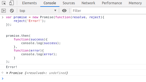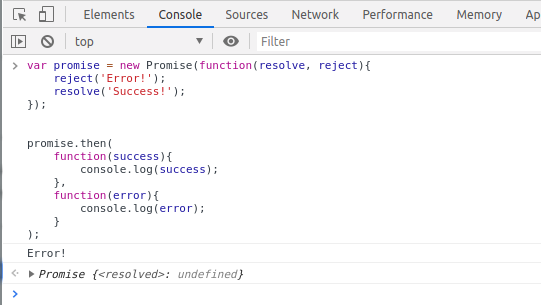 vậy hai hàm trong then chỉ xảy ra một trong hai trường hợp nhưu ta sử dụng truyền vào param là resolve , reject . Nếu ta khai báo cả hai thì nó chỉ nhận giá trị đầu tiên thôi .