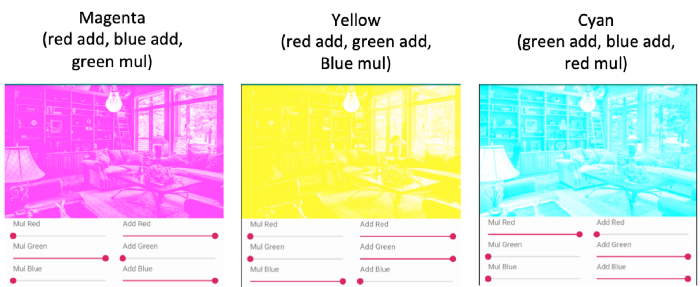 Tạo một colorfilter(bộ lọc màu) với việc nhân các RGB channel với một màu và sau đó thêm vào màu thứ hai. Các phần alpha của mull và add sẽ bị bỏ qua. :-?