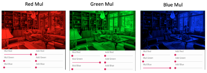Nếu chúng ta muốn có màu chính (Red, Green hoặc Blue) của hình ảnh, chúng ta chỉ cần đặt Mul cụ thể của màu đó ở mức tối đa: