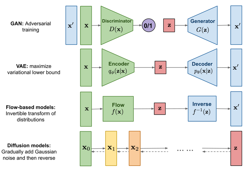 Như mình có đề cập ở phần trên, thì Auto-Encoder (AE), GAN và Flow-based model đều thuộc dòng họ Generative model. Generative model là những model có khả năng sinh dữ liệu nhờ vào việc ánh xạ dữ liệu lên một vùng không gian ẩn nào đó, rồi từ vùng không gian ẩn này thì sẽ sinh ra dữ liệu. Còn nhớ thời các mô hình này mới ra đời thì hai cái "dòng họ" này đã làm mưa làm gió, và đã có rất nhiều paper cũng như ứng dụng được thực hiện. Tuy nhiên thì các model này hiện nay cũng bộc lộ nhiều hạn chế: