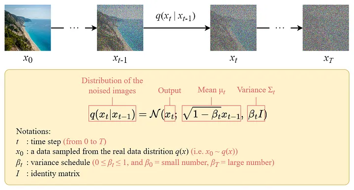 Khi mỗi điểm dữ liệu được làm nhiễu như vậy, thì khi đó, ta có thể biểu diễn phân phối của ảnh nhiễu tại hai step liên tiếp dưới dạng: