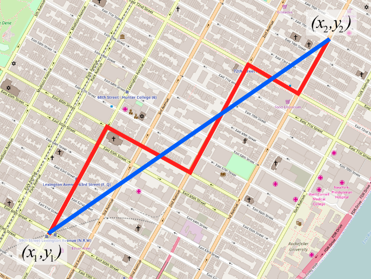 Để so sánh với Euclide Distance thì có thể hiểu trên map Euclide Distance là đường chim bay (màu đỏ) còn Manhattan là đường bộ (màu xanh) theo các block nhà :v