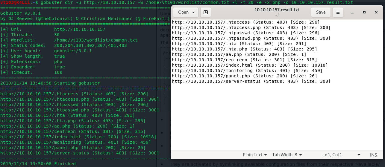 gobuster dir -u 10.10.10.157 -w /home/vt103/wordlist/common.txt -l -t 30 -e -x php -o 10.10.10.157.result.txt
