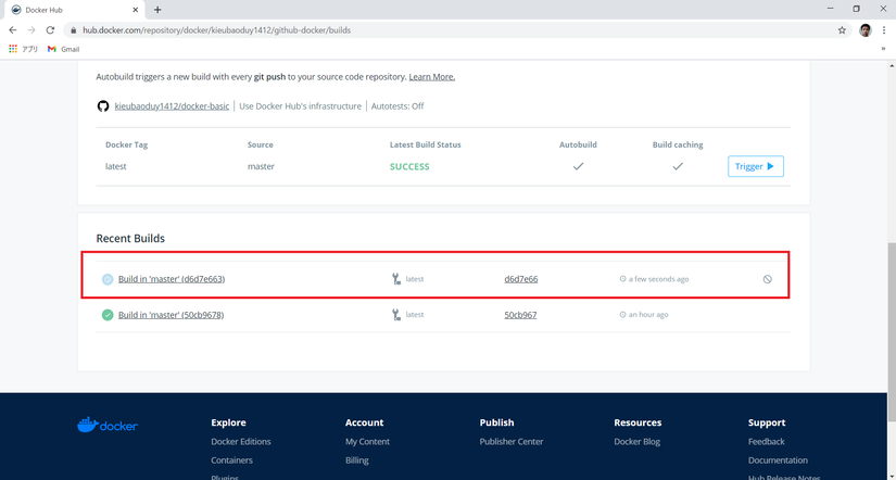 GitHubにindex.html修正しCommitした後でDockerHubにて自動的にImageをビルドすることを確認する。