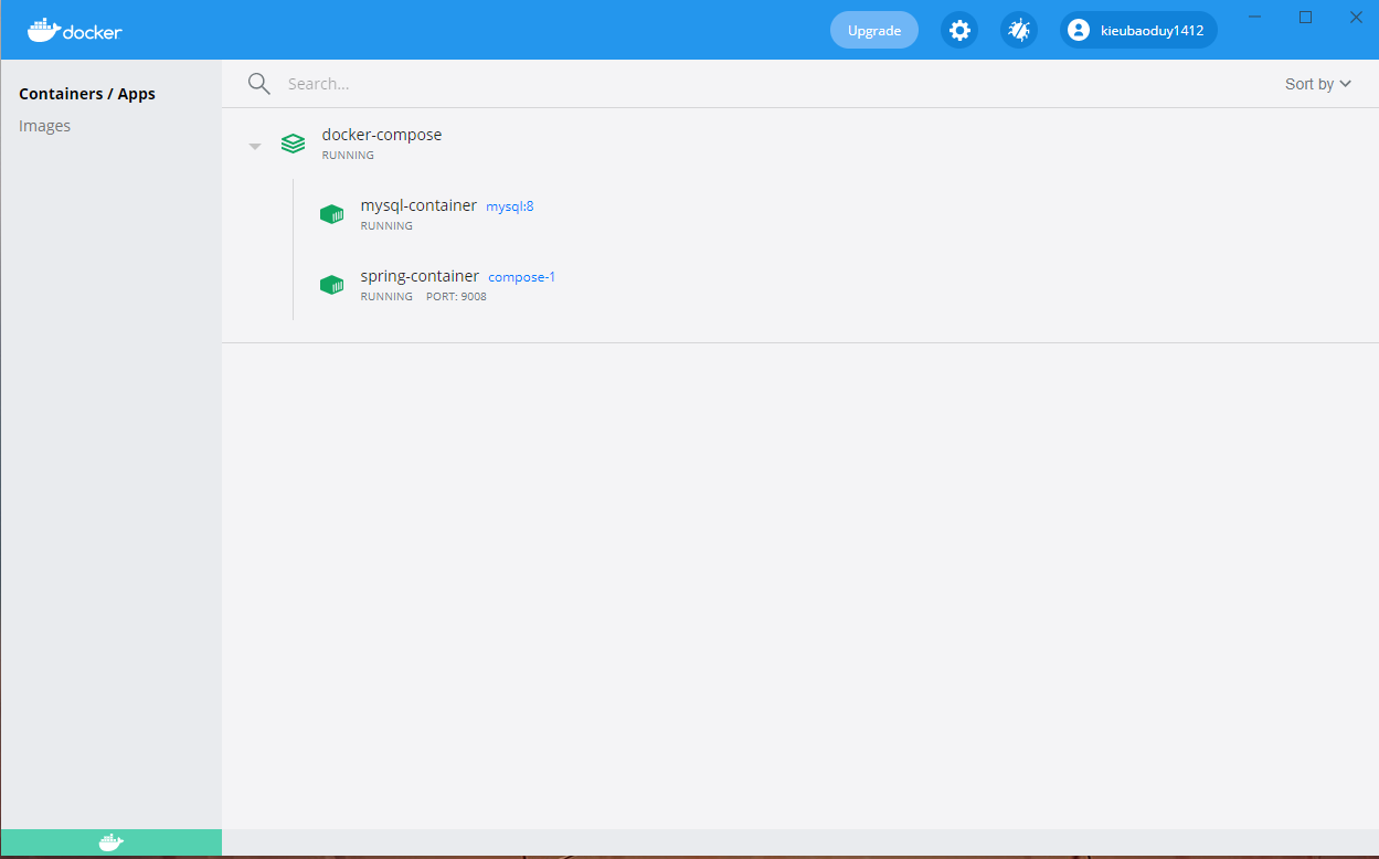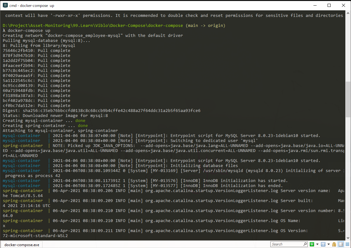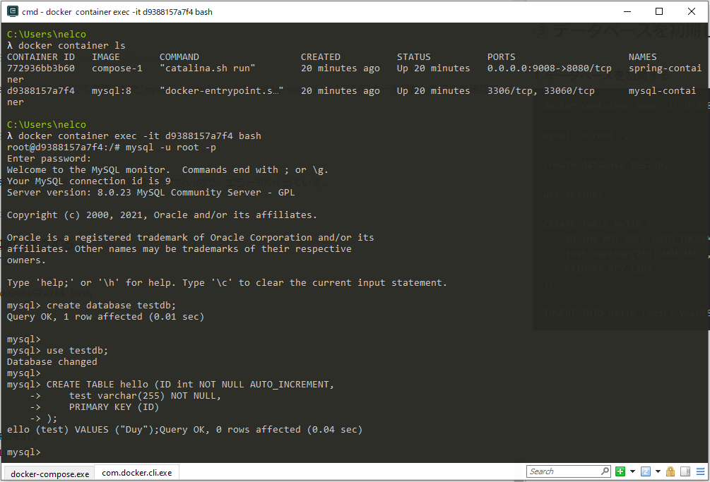 docker-composeの中でdocker-compose.ymlにて定義されたmysql-containerとspring-containerコンテナーを起動したことを確認できる