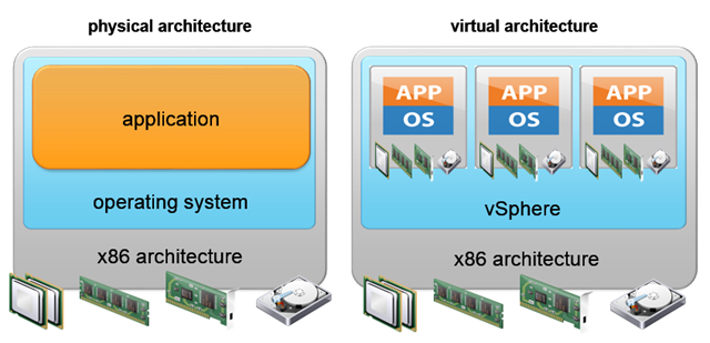 Để cải thiện khả năng sử dụng tài nguyên của máy tính thì công nghệ virtualization (hình bên phải) đã ra đời , thường được gọi là VMware hay Virtualbox. Công nghệ này cho phép cài đồng thời nhiều OS trên 1 máy tính, như vậy sẽ cho phép sử dụng tối đa tài nguyên của hệ thống đồng thời tận dụng được nhiều ưu thế khi sử dụng các OS khác nhau.