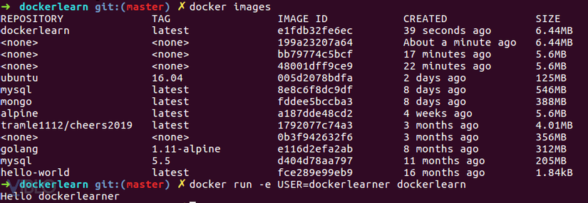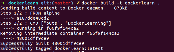 Ở đây nó thực hiện lệnh echo "DockerLearning", tức là xuất ra dòng "DockerLearning" trên command trong quá trình run build image.