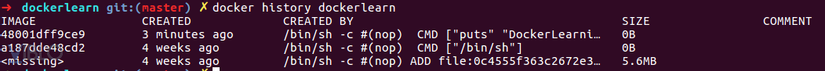 - Để xem lại quy trình đóng gói image gồm 2 step giống như đã định nghĩa trong Dockerfile bằng lệnh: