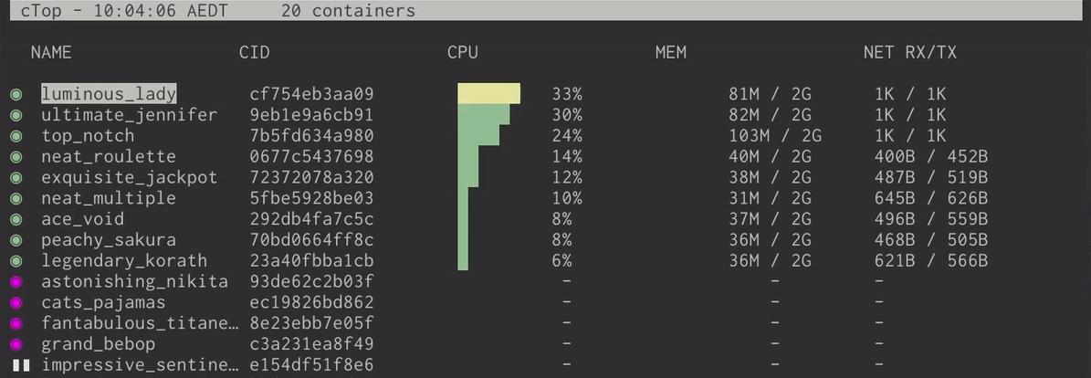 CTOP mô tả trực quan các thành phần CPU, MEM, NET mà các container đang sử dụng.