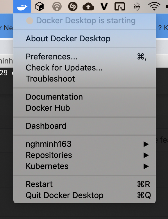 Okay, sau khi đã cài đặt xong hãy mở docker lên và chờ trong chút lát để Docker tiến hành khởi động. Có 1 tip giúp các bạn biết docker đã khởi động lên chưa là nhìn vào thanh Taskbar (ở Windows) hoặc MenuBar (ở Mac), nếu Icon con cá voi chuyển động thì docker đang starting còn nếu mà đã khởi động thành công thì sẽ đứng yên