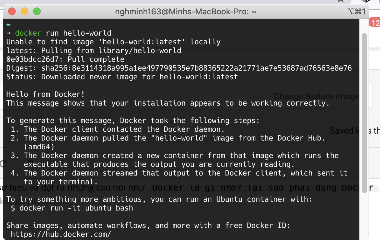 Để kiểm tra hãy mở Terminal lên và gõ docker run hello-world, nếu như hình bên dưới thì coi như bạn thành công rồi đó