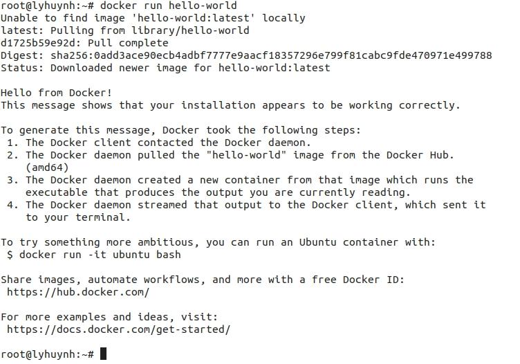 Để test thử thành công hay khồng chúng ta mở terminal thử chạy một image kinh điển : hello-world