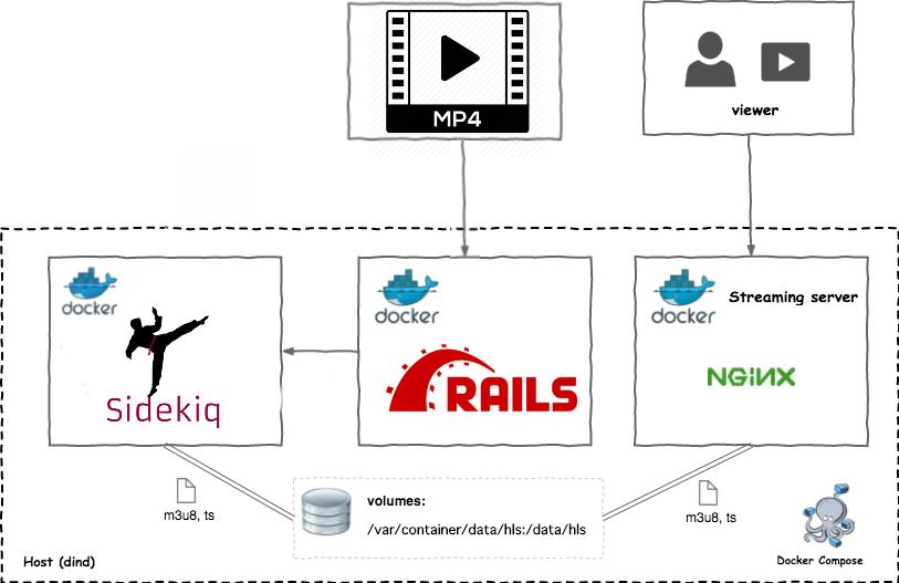 Nói qua về app demo trong bài này để dễ hình dung. Tác vụ chính của app sẽ là upload videos, render videos và stream videos. Mình sẽ dùng Rails làm backend xử lý video được upload lên, sau đó convert nó qua dạng videos có thể stream được và nginx sẽ stream nó tới client.