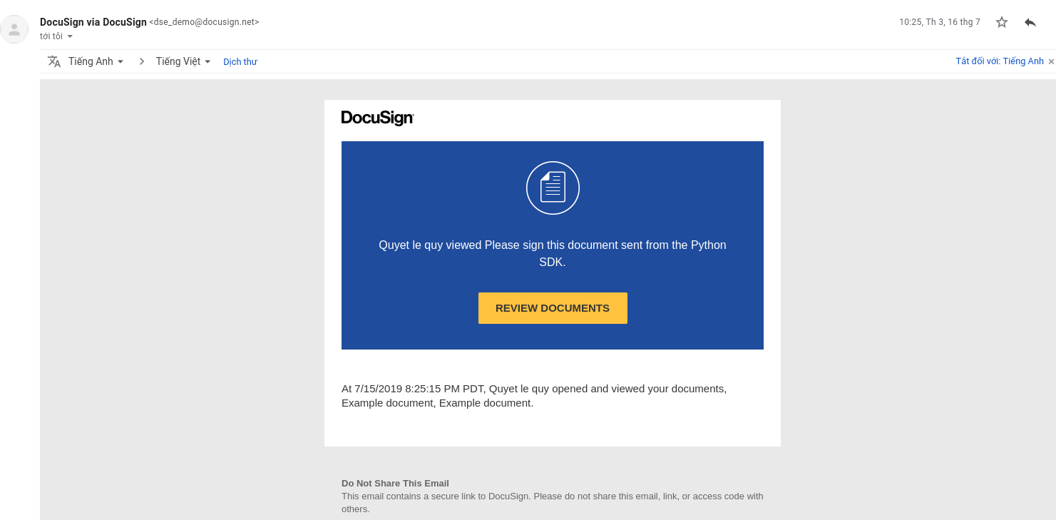 Sau khi định nghĩa Envelope đầy đủ, sử dụng CreateEnvelope của thư viện SDK trên để gửi. Trong code mình để trạng thái là sent nên tài liệu sẽ được Docusign gửi ngay sau khi tạo