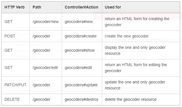 Đặc biệt trong Rails còn hỗ trợ cho chúng ta tạo Singular Resources. Loại resources này sẽ được sử dụng trong trường hợp chúng ta muốn thao tác với 1 bản ghi duy nhất trong 1 bảng ví dụ khi ta muốn hiển thị trang cập nhật tài khoản của 1 người nào nó mà không cần biết id của người này