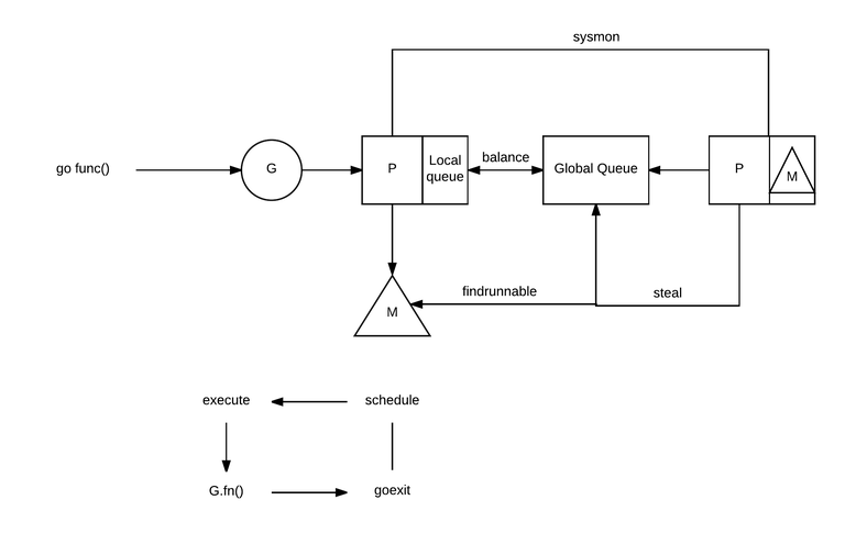 - Để thực thi được goroutine, M cần được trong context của P. Machine, sau đó sẽ pop goroutine ra khỏi queue P và thực thi code.