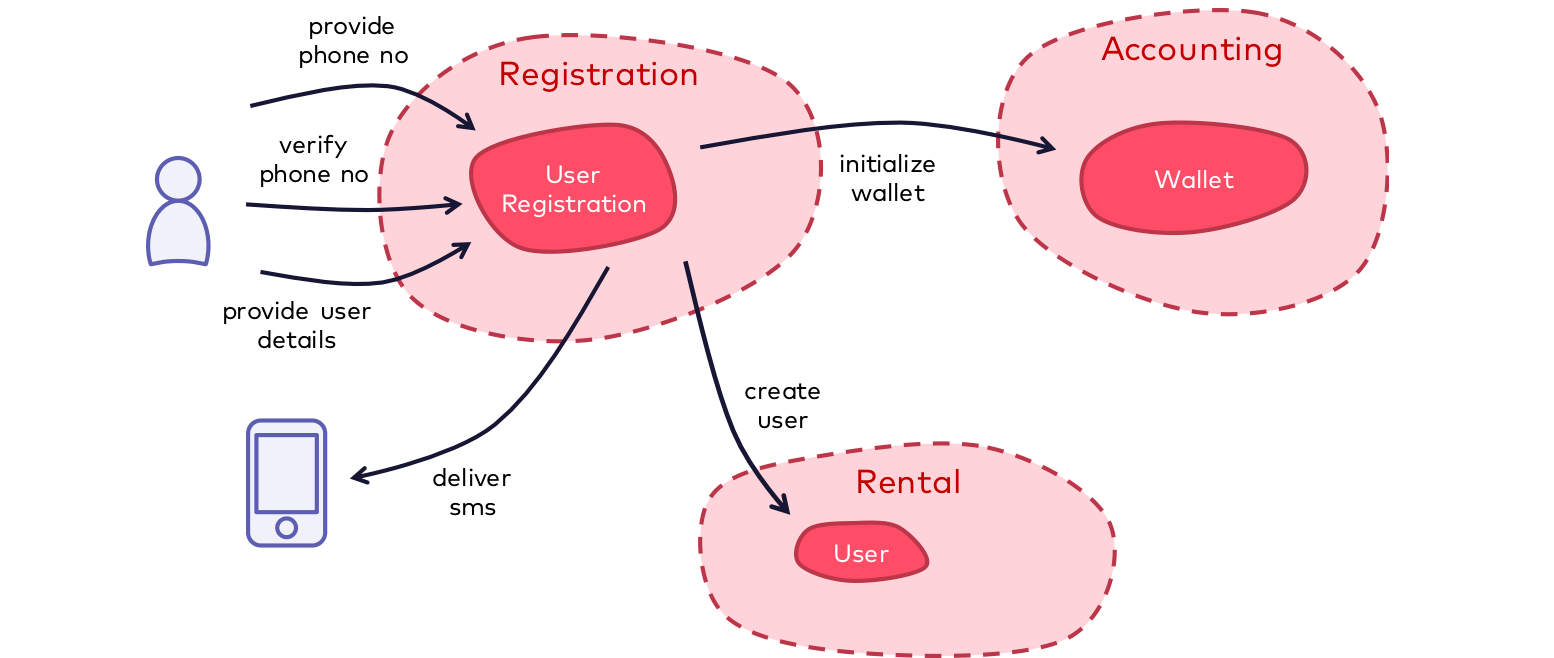 Aggregate UserRegistration cũng có thể publish tới các phần khác bên trong hoặc bên ngoài bounded context và do đó có thể kích hoạt thêm domain logic hoặc cập nhật một số trạng thái khác. Trong ví dụ của chúng ta, đó là 2 bounded context Accounting (cho việc khởi tạo ví điện tử) và Rental (dành cho việc tạo người dùng đã đăng kí).