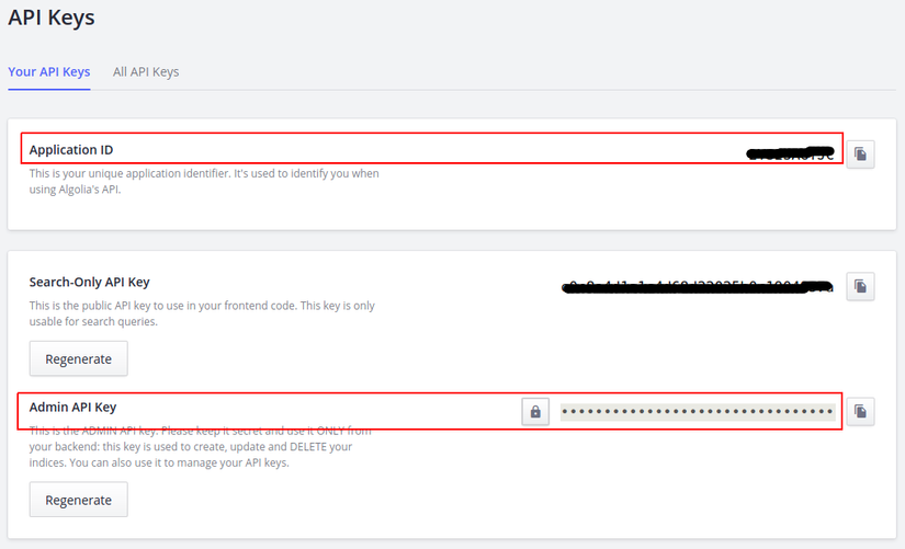 Vào mục API Keys trên Algolia để biết được các thông tin Algolia key của project của bạn nhé