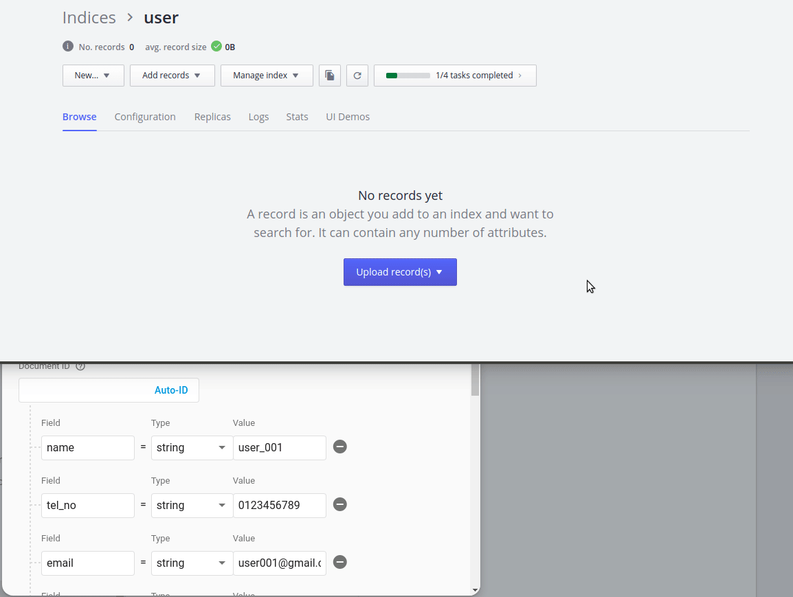 Và bên trong index "user" vừa tạo của bạn