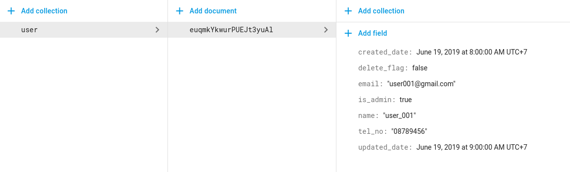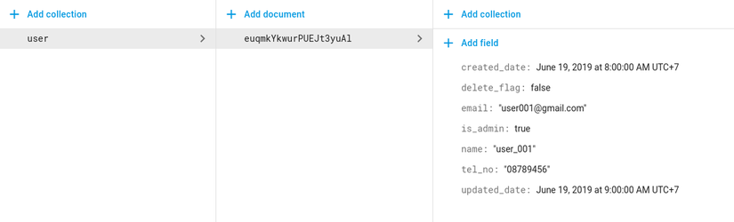 Vd: Ở Cloud Firestore mình có 1 collection "user" như sau: