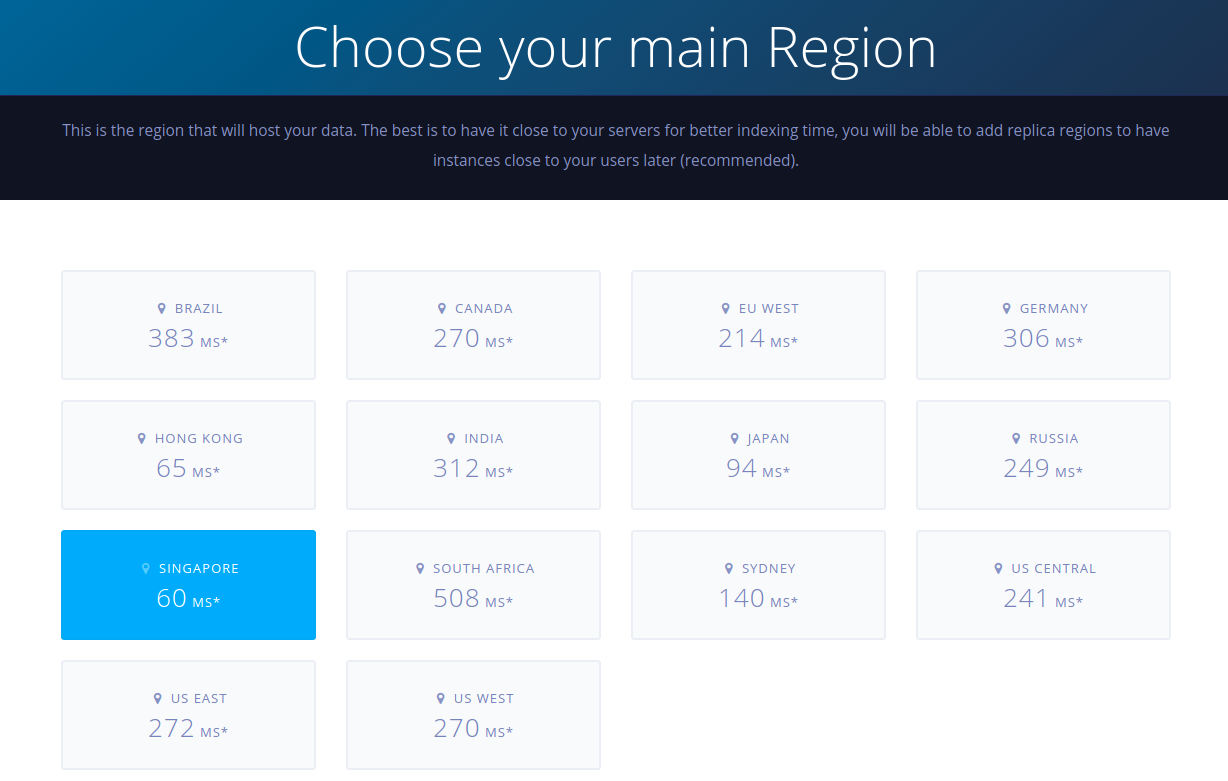 là đến phần chọn vùng mà Algolia sẽ lưu data của bạn thì bạn nên chú ý chọn vùng gần mình nhất để tốc độ truy vấn data và search ra ở Algolia là nhanh nhất. Số 60ms (miliseconds) ở đây là thời gian response lại từ vị trí vùng của bạn nên số này càng thấp là càng tốt bạn nhé.