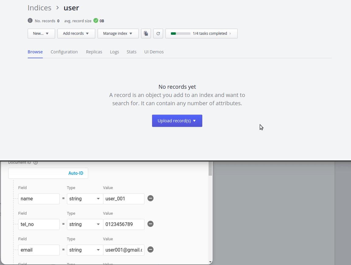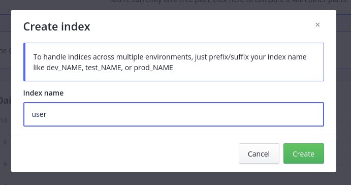 là trong suốt với người dùng và không cần thiết cho việc search, vậy thì trên Algolia bạn có thể xây dựng 1 index "user" và đưa data lên và lưu lại từ FireStore data của 3 field name, email, tel_no mà thôi. Tên của index có thể là bất kì từ gì bạn muốn mà không bắt buộc phải giống với tên collection ở Firestore đâu. Tuy nhiên để đơn giản và tránh nhầm lẫn, ở đây mình sẽ tạo 1 index có tên user tương ứng với collection user đã có trước đó ở Cloud Firestore.