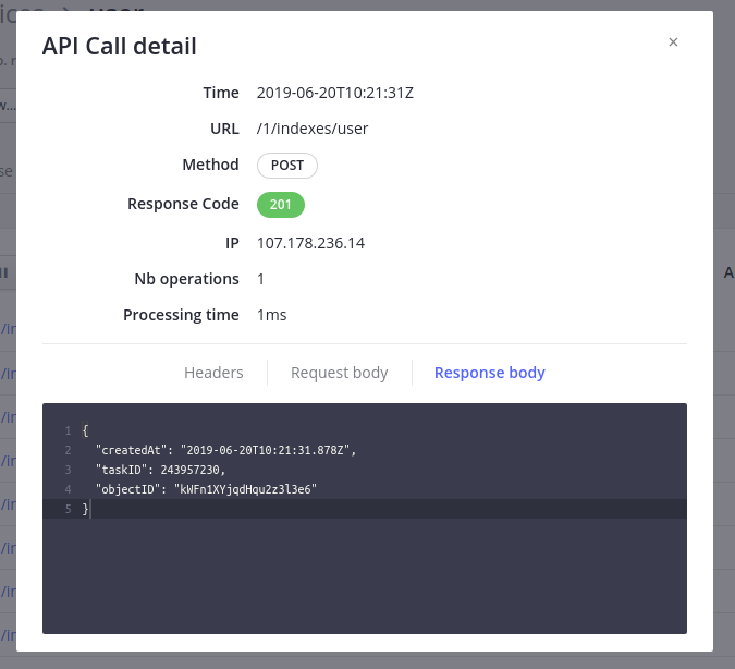 Vì vậy, mặc dù Processing time khi xem chi tiết API này chúng ta thấy chỉ tốn 1ms thực tế nó tốn 1ms để tạo ra ObjectID nhưng lúc này nó vẫn chưa thể search được trên Algolia. (Docs của Algolia cũng có nhắn đến việc này nè: https://www.algolia.com/doc/rest-api/search/?language=javascript#add-object-without-id)