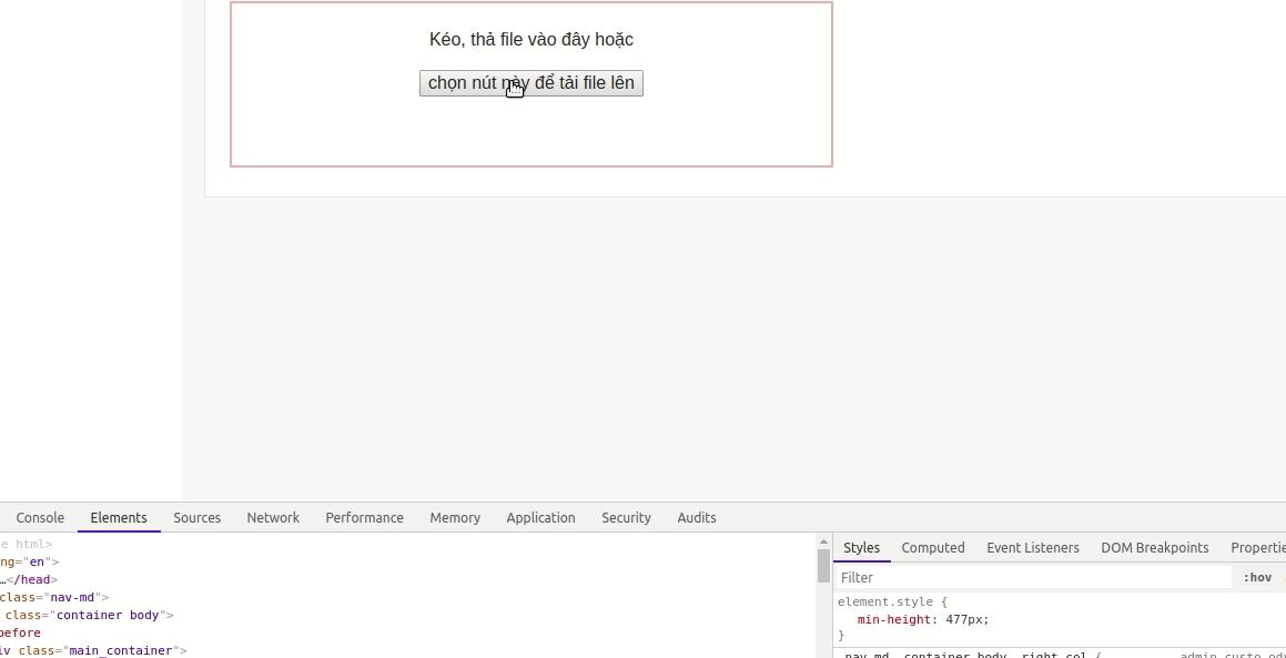 dictDefaultMessage: Là message hiển thị trong các element có class là .dropzone. Ở đây mình để trống để custom lại view.uploadMultiple: true. Cho phép bạn lựa chọn upload nhiều file.url:là đường dẫn để thực hiện POST request sau khi file tải lên. Hiện tại khi click vàodiv#mydropzonesẽ có cửa sổ upload file hiện lên như thế này: