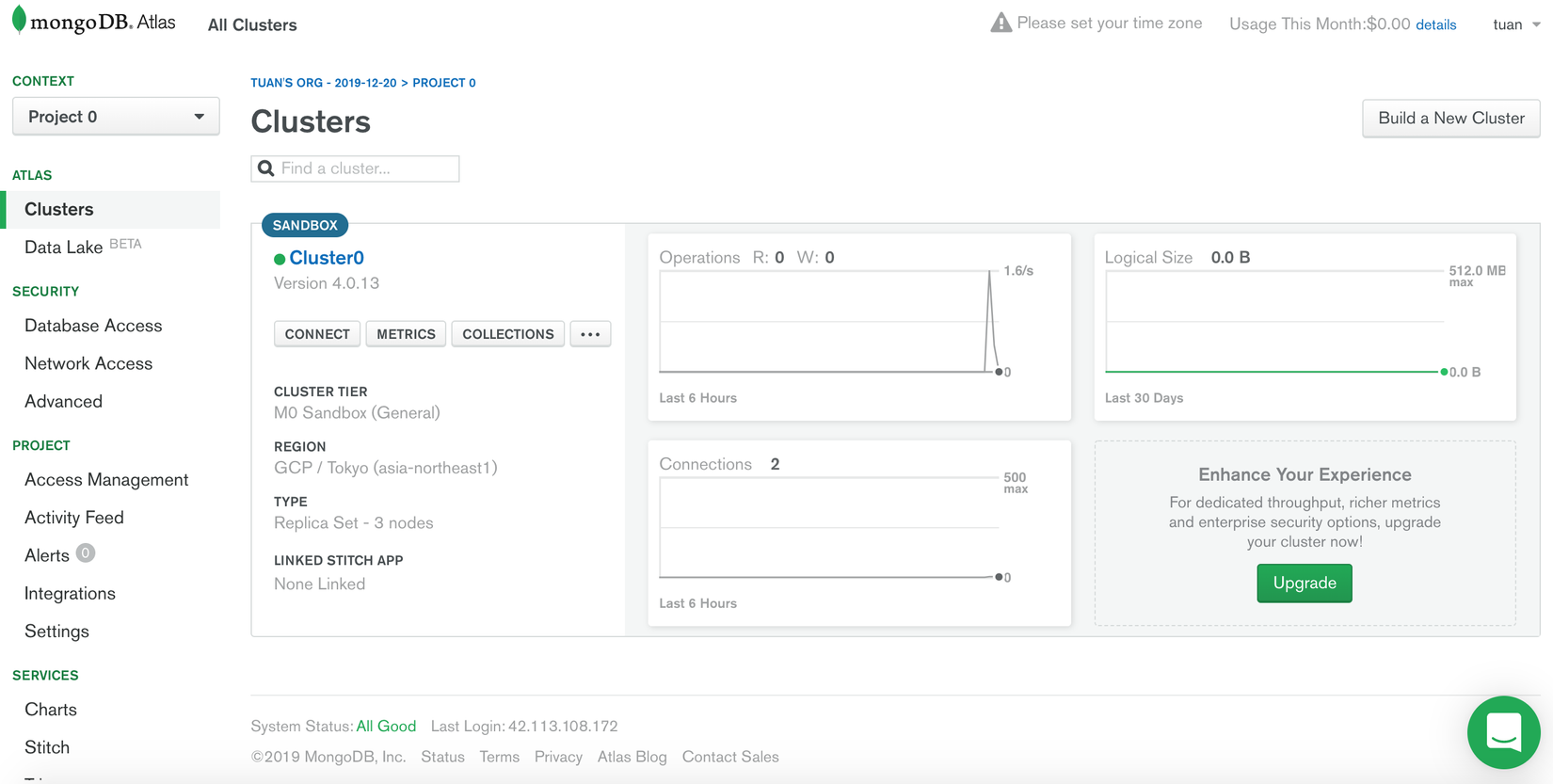 Lựa chọn Create Cluster bạn sẽ được chuyển đến giao diện quản lý, điều mình thích ở Atlas là giao diện của nó cực kỳ thân thiện chứ không rối mắt như thằng AWS