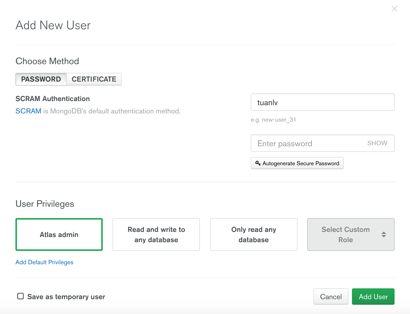 Bấm vào Database Access bạn sẽ đi đến màn hình quản lý user. Tại đây bạn có thể tạo ra user với các quyền là: Admin, Read and Write, Only Read và bạn có thể tạo ra Custom Role như quyền write hoặc read một Database cụ thể.