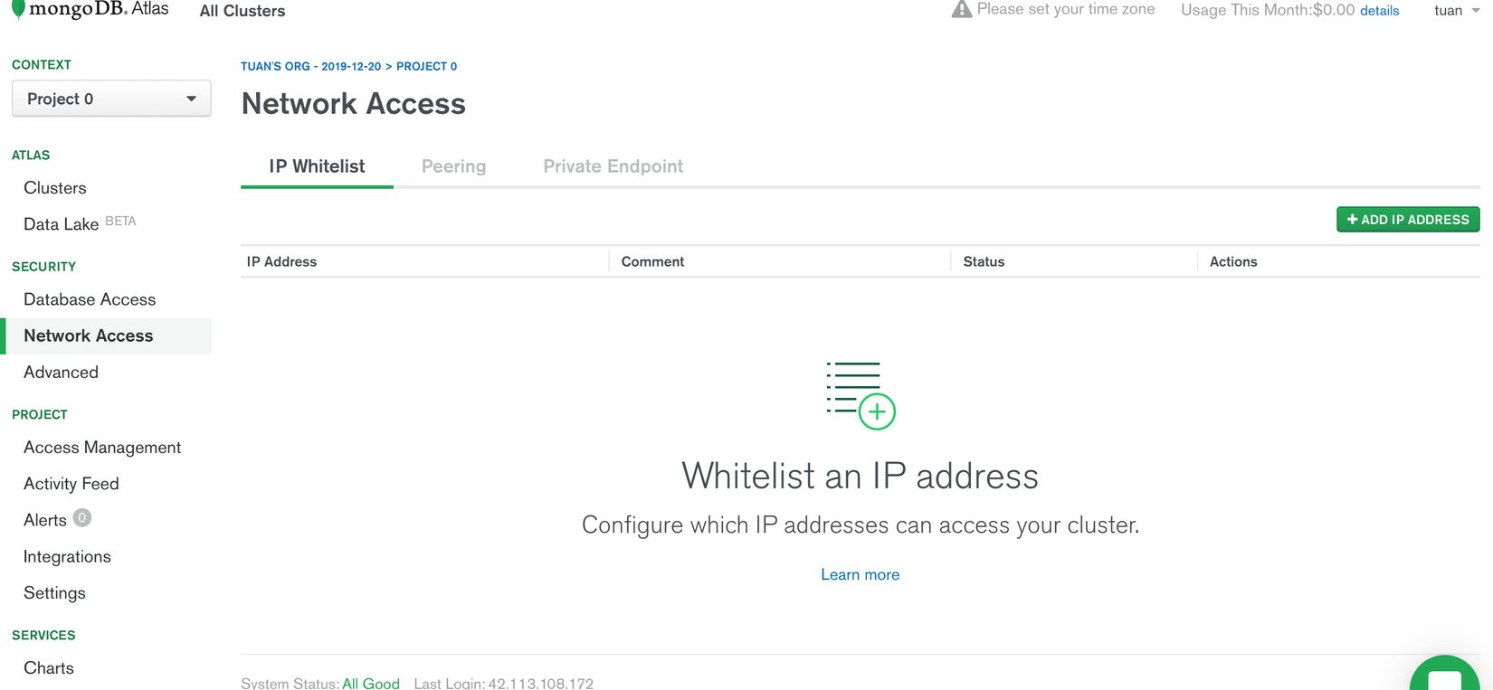 Tại đây bạn có thể quản lý những IP được phép connect đến Database của bạn. Bấm vào ADD IP ADDRESS để thực hiện thêm địa chỉ IP.