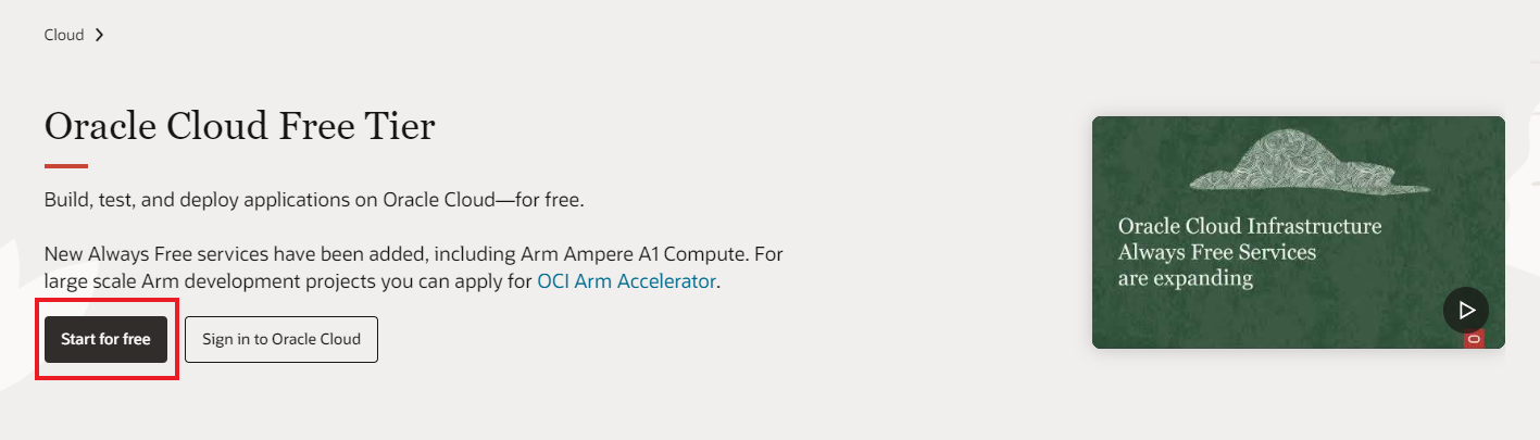 - Đầu tiên bạn truy cập vào trang Oracle Cloud Free để đăng ký tài khoản. Bấm nút Start for free để bắt đầu đăng ký tài khoản: