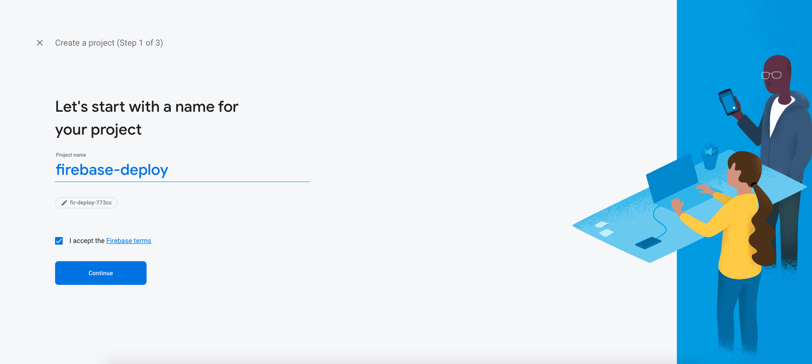 Ở trường project name, hãy chọn tên cho project của bạn, ở đây mình đặt là firebase-deploy.