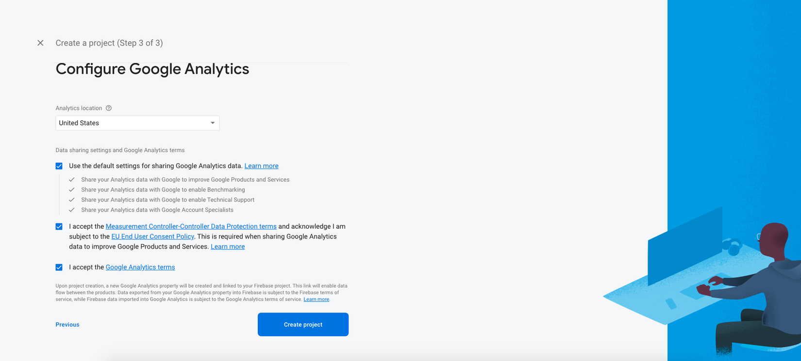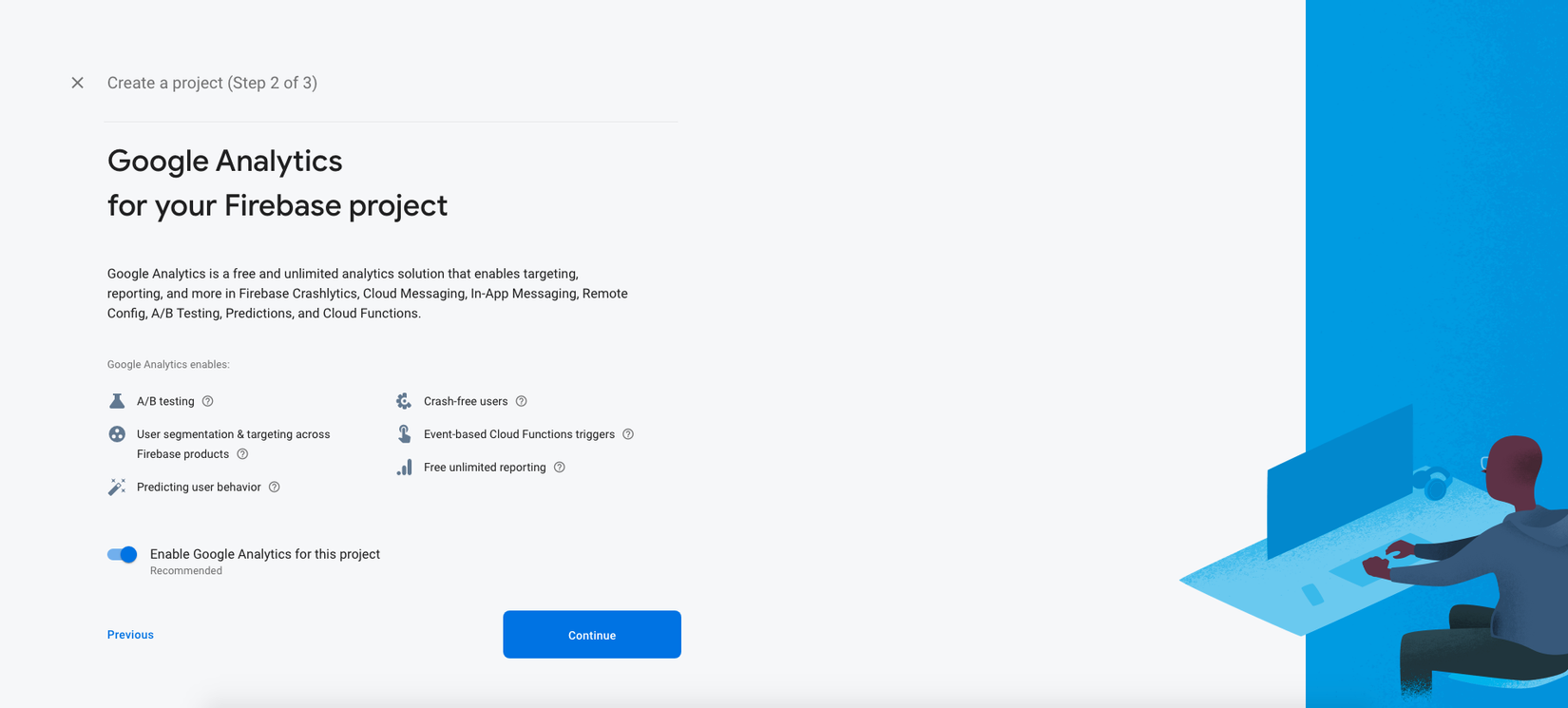 Tick chọn I accept Firebase terms rồi bấm Continue.