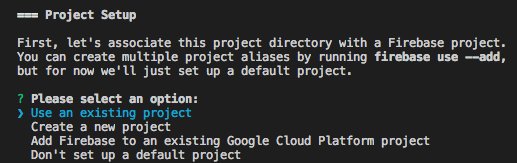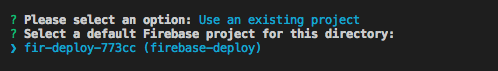 Chọn tiếp Use an existing project để chọn project chúng ta vừa tạo ở trên. Project firebase-deploy sẽ hiện ra ở đây, tiếp tục Enter để chuyển đến phần Hosting Setup