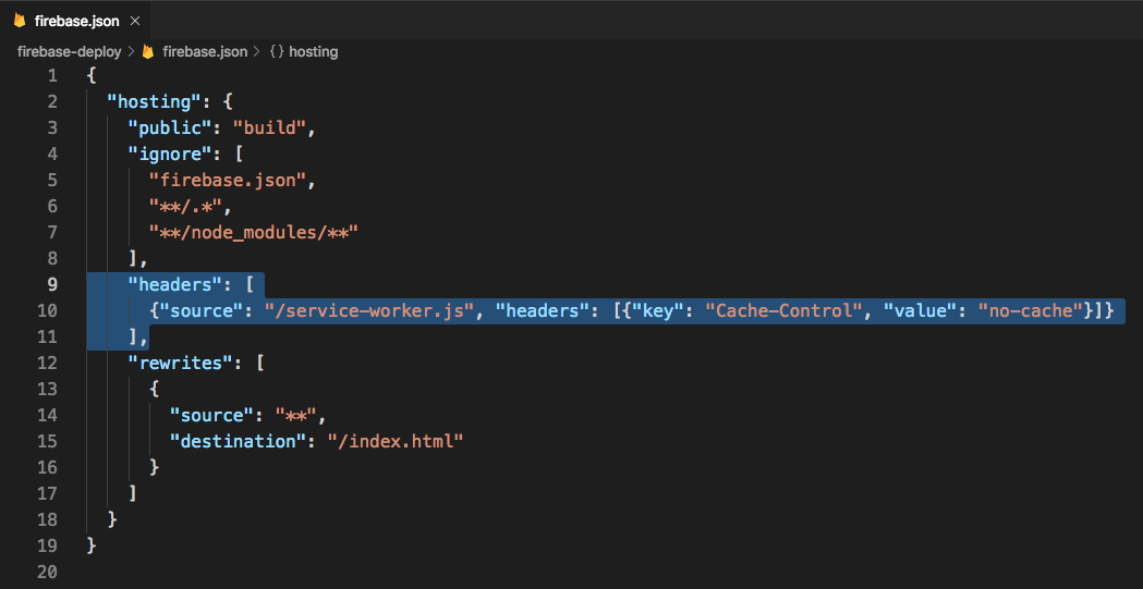 Mở filebase.json ra và thêm đoạn headers vào trong hosting như sau: