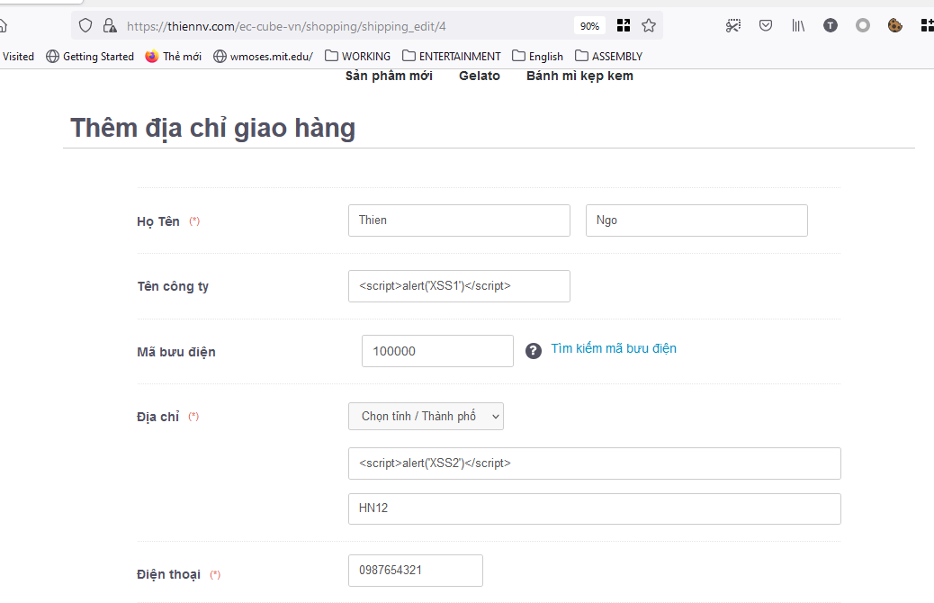 - Nhập thông tin đơn hàng với các đoạn mã javascript độc hại:
