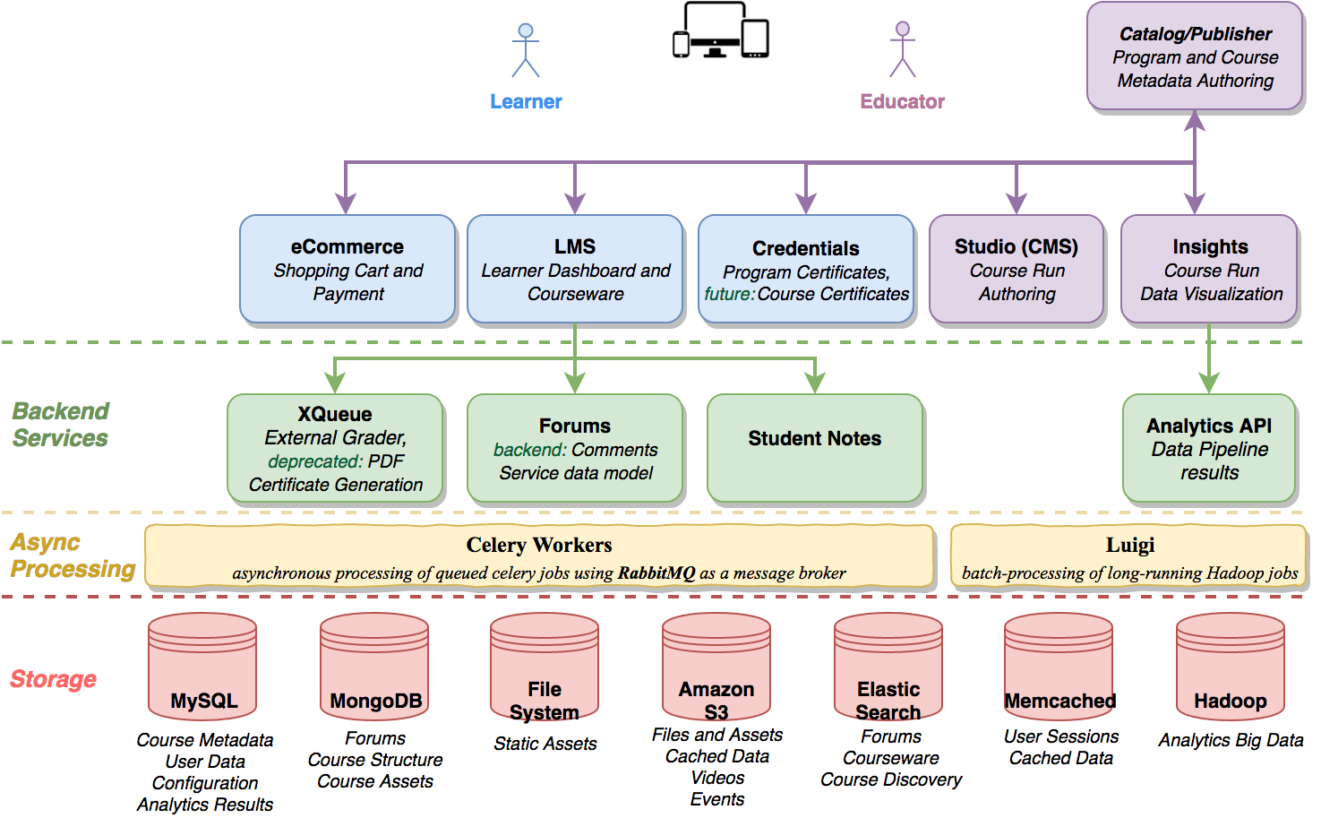 - Open edX LMS: Đây là Hệ thống quản lý học tập, nơi người học đăng ký và đăng nhập để truy cập các khóa học của họ. Giáo viên cũng sử dụng Open edX LMS để truy cập một số công cụ quản lý như thống kê khóa học, đăng ký thủ công, quản lý sổ điểm, báo cáo khóa học, cấu hình chứng chỉ, email.