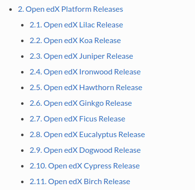 Lilac là phiên bản mới nhất được công bố năm 2021. Các phiên bản edX được đặt tên theo thứ tự bảng chữ cái và theo tên của các loài thực vật. Chu kỳ phát hành giữa các phiên bản là 6 tháng.
