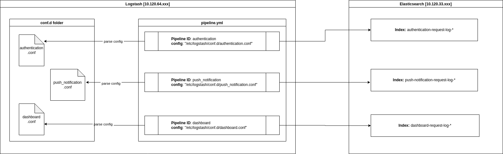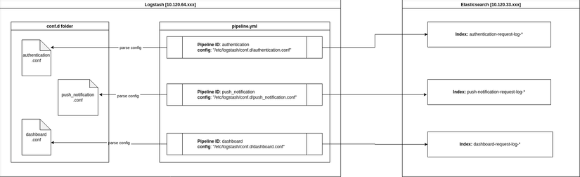 - output {}: Khối này quy định đầu ra tiêu chuẩn cho một quá trình xử lý luồng dữ liệu trong Logstash. Trong trường hợp này là Elasticsearch cluster, các dữ liệu được thu thập sẽ được phân phát về các index được khai báo trong config.