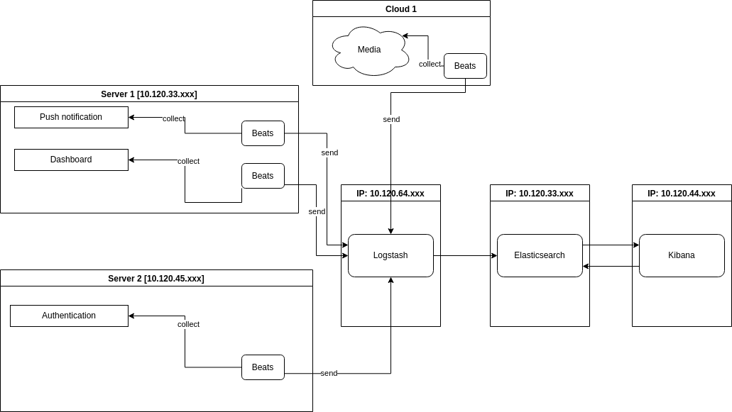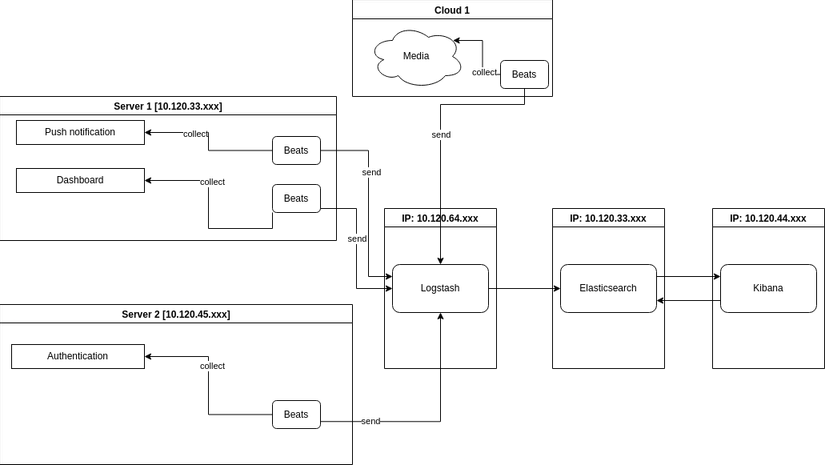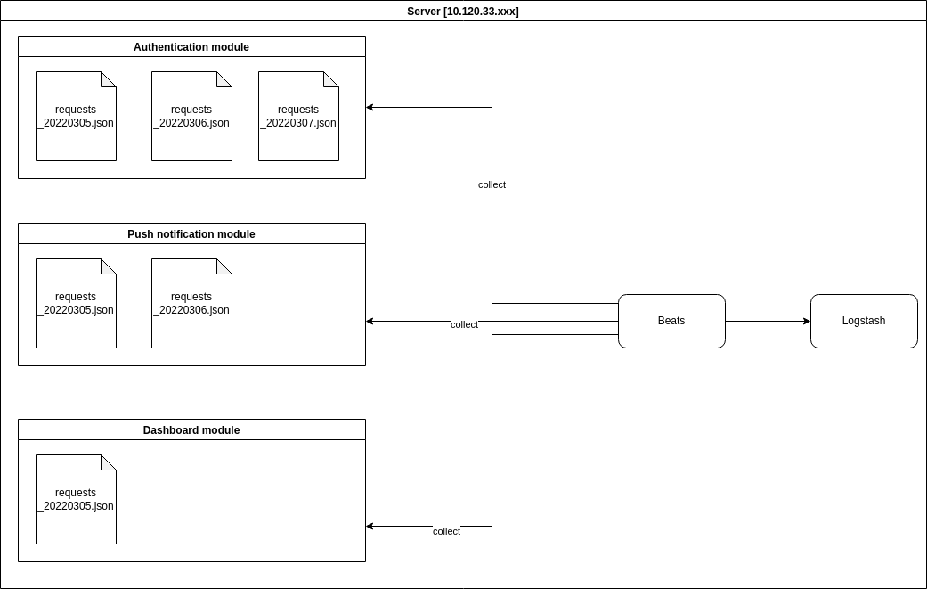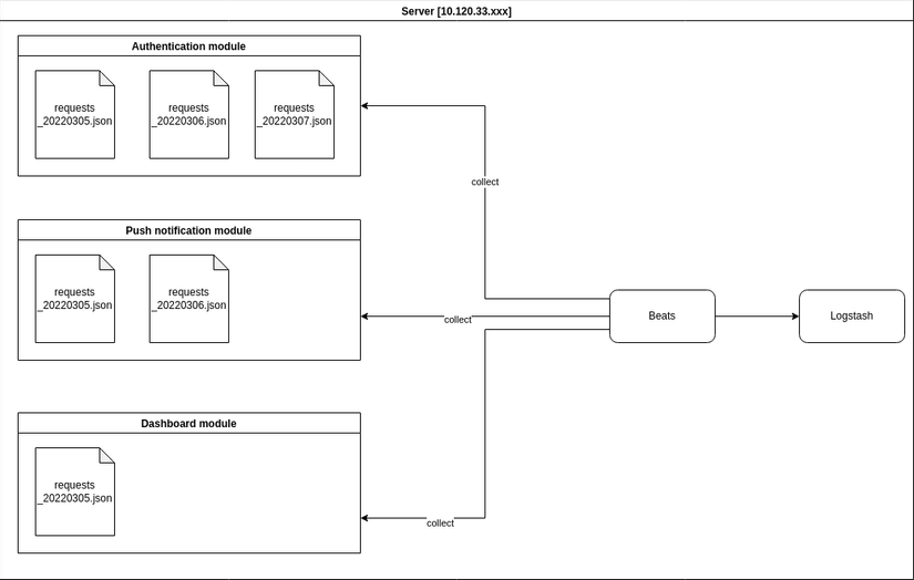 Như đã thấy, mỗi một máy chủ được cài đặt Beats. Mỗi module là 1 beat instance. Beat instance thu thập tất cả request log files trong module đã được khai báo trong file cấu hình (filebeat.yml). Và gửi chúng qua Logstash.