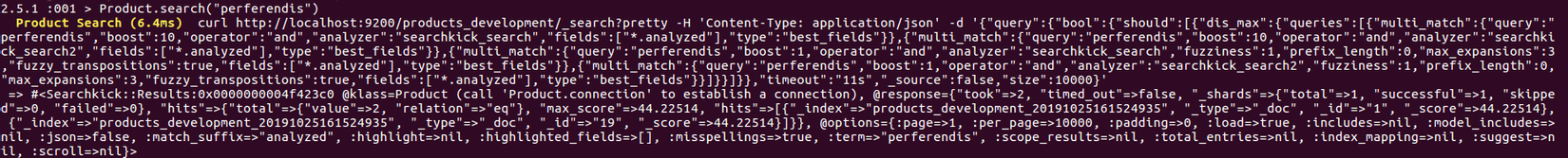 results = Product.search("your key word") results.size results.length results.any? results.each {|result| ... } Searchkick::Resultcòn có thêm 2 method làtookvàresponse# thời gian thực hiện search (ms) results.took # response elasticsearch trả về (JSON) results.responseSearchkick::Resultcòn có thêm 1 method làtotal_counttrả về toàn bộ product search được khi chưa pagination, khác với methodcount,lengthhaysize- Ví dụ