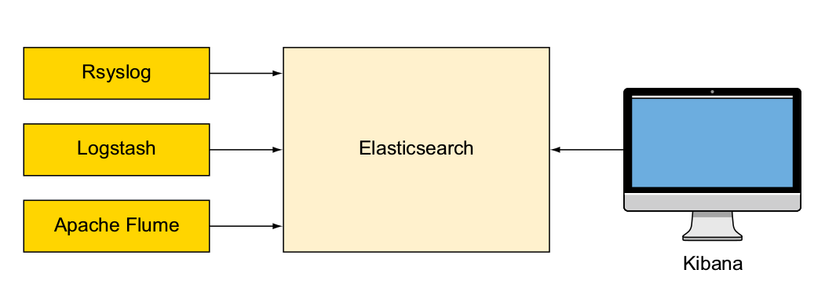 Ví dụ: giả sử bạn muốn triển khai hệ thống logs quy mô lớn để lưu trữ, tìm kiếm và phân tích một số lượng lớn các sự kiện(event). Như được hiển thị trong hình dưới, để xử lý logs và xuất ra Elaticsearch, bạn có thể sử dụng các công cụ ghi nhật ký như Rupyslog (www.rsyslog.com), Logstash 2 (www.elastic.co/products/logstash) hoặc Apache Flume (http://flume.apache.org). Để tìm kiếm và phân tích các log đó trong giao diện trực quan, bạn có thể sử dụng Kibana (www.elastic.co/products/kibana).
