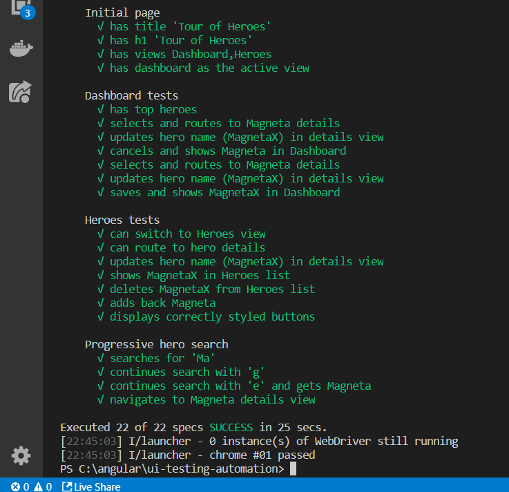Khi chạy ở chế độ headless, trình duyệt sẽ không tự động mở ra như khi chạy bình thường. Điều này sẽ phù hợp nếu chúng ta chạy nó cho mục đích Continues Integration (CI). Để làm được vậy chúng ta cần phải cập nhật lại file protractor.conf.js như sau: